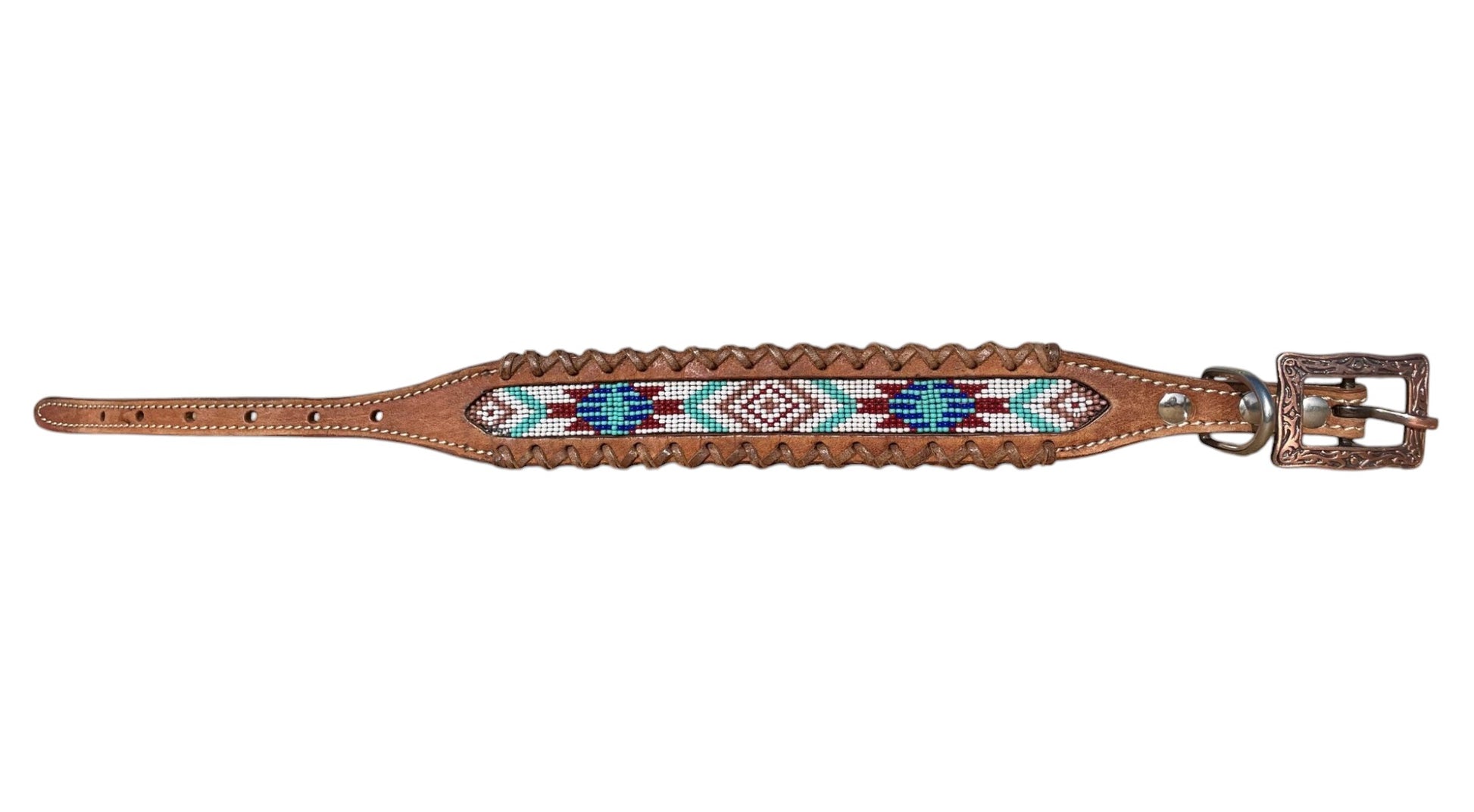 Genuine Leather Dog Collar with Beaded Inlay and Buck Stitch